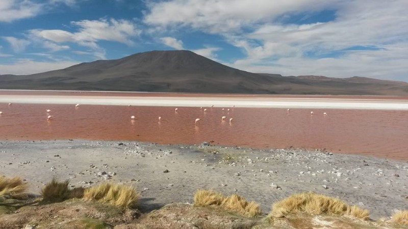 Nous posons les affaires dans notre nouvelle auberge et nous repartons vers une autre lagune : la Laguna Colorada. C’est un lac tout rouge du fait de ses algues aussi. Il est grand et rempli de flamants roses et de lamas. Nous avons fait le tour à pied malgré un sacré vent (ah oui en ce moment c’est la saison des vents ici). C’est une couleur qui restera gravée dans les mémoires tant elle est peu commune.