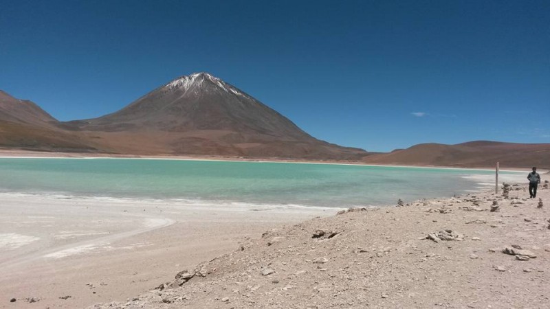 Ensuite nous avons pu voir la Laguna Verde. C’est une lagune verte (comme son nom l’indique) car elle a des algues toxiques qui lui donne cette couleur (en lien avec le volcan juste au dessus). Sauf que ces dernières années d’autres algues ont colonisé le lac modifiant sa couleur. Donc le guide nous a dit que plus il y a de vent plus la lagune est verte. Ce jour là la couleur était jolie mais pas au maximum malgré un vent déjà très fort !